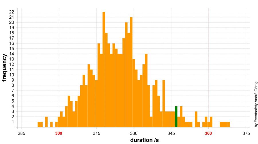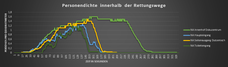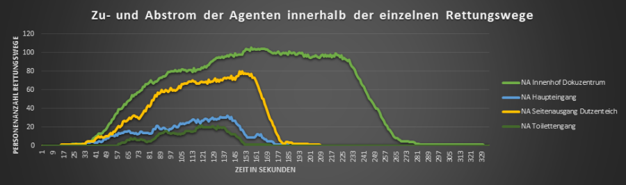 Bei der Entfluchtungsanalyse muss die Entfluchtungsdauer kleiner sein, als die zur Verfügung stehende (in der CFD-Simulation ermittelte) Zeit.